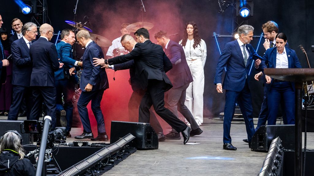 Rookbom op podium gegooid na de toespraak van Schoof; beide premiers werden direct van het podium gehaald door beveiligers.